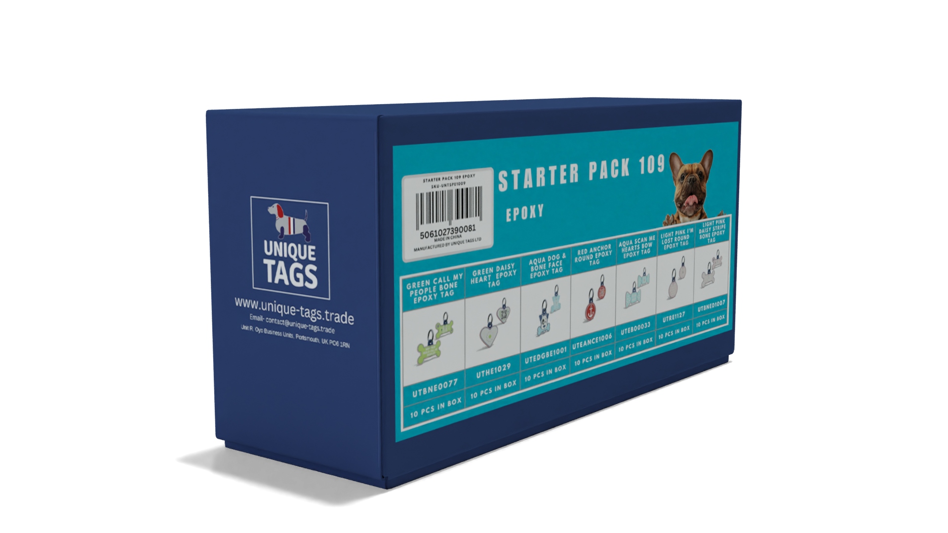 This exclusive epoxy Starter Pack with 70 pieces in total offers quite a variety. The pack features 7 types of epoxy QR tags with 10 of each design, accounting for 70 pieces, that have specific names like the Aqua-Daisy Hearts-Bone-Epoxy Tag, Dark Pink-I Love my Mum-Heart-Epoxy Tag, Light Pink-I Need Food-Epoxy Tag, etc. This assortment will provide ample options for your needs.