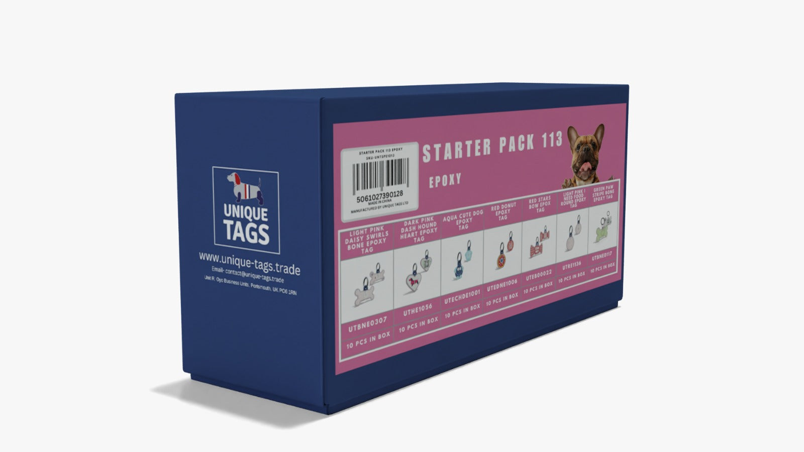 This exclusive epoxy Starter Pack with 70 pieces in total offers quite a variety. The pack features 7 types of epoxy QR tags with 10 of each design, accounting for 70 pieces, that have specific names like the Aqua-Daisy Hearts-Bone-Epoxy Tag, Dark Pink-I Love my Mum-Heart-Epoxy Tag, Light Pink-I Need Food-Epoxy Tag, etc. This assortment will provide ample options for your needs.