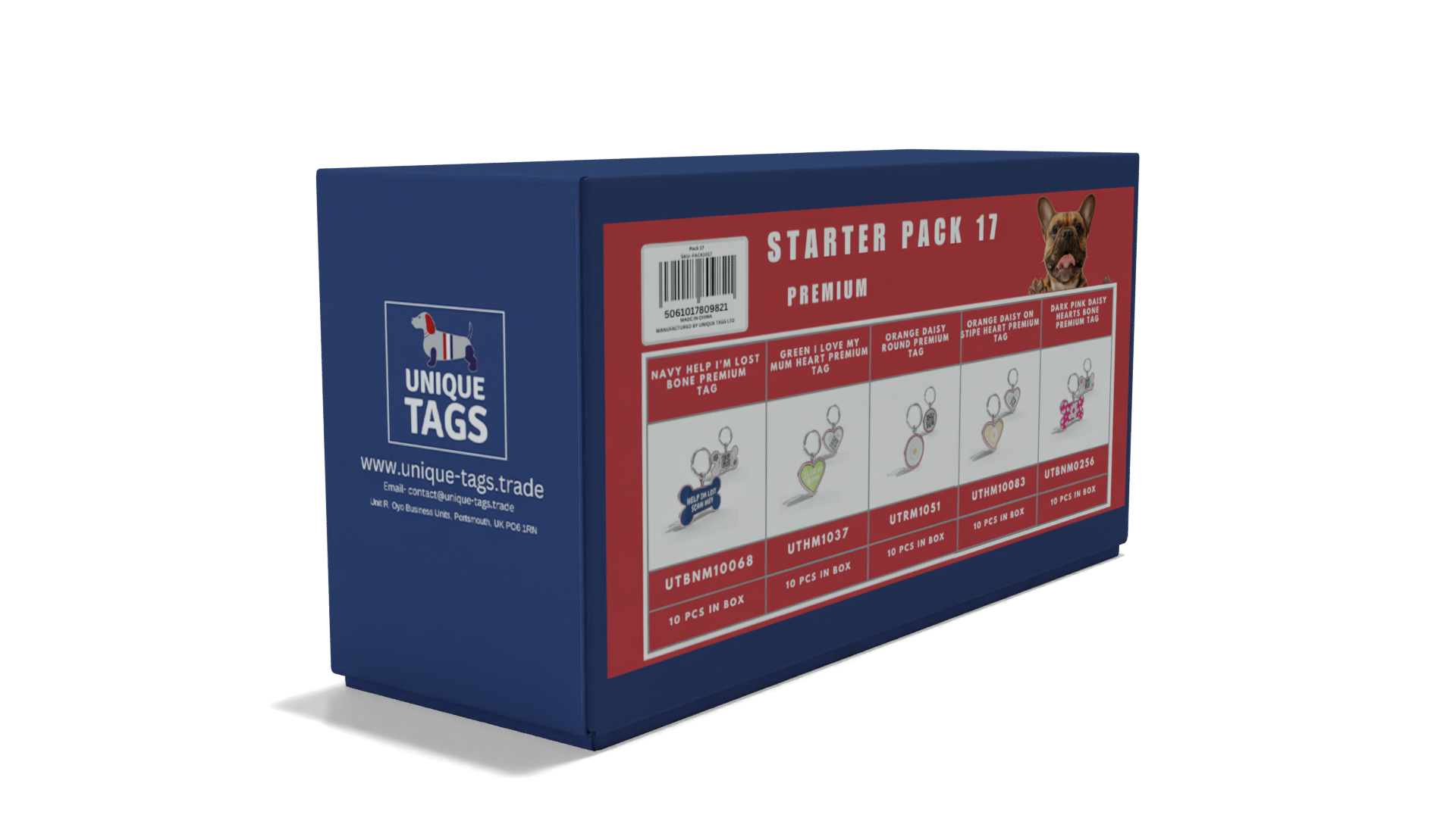 This exclusive Premium Starter Pack with 50 pieces in total offers quite a variety. The pack features 5 types of premium QR tags with 10 of each design, accounting for 50 pieces, that have specific names like the Aqua-Daisy Hearts-Bone-Premium Tag, Dark Pink-I Love my Mum-Heart-Premium Tag, Light Pink-I Need Food-Premium Tag, etc. This assortment will provide ample options for your needs.