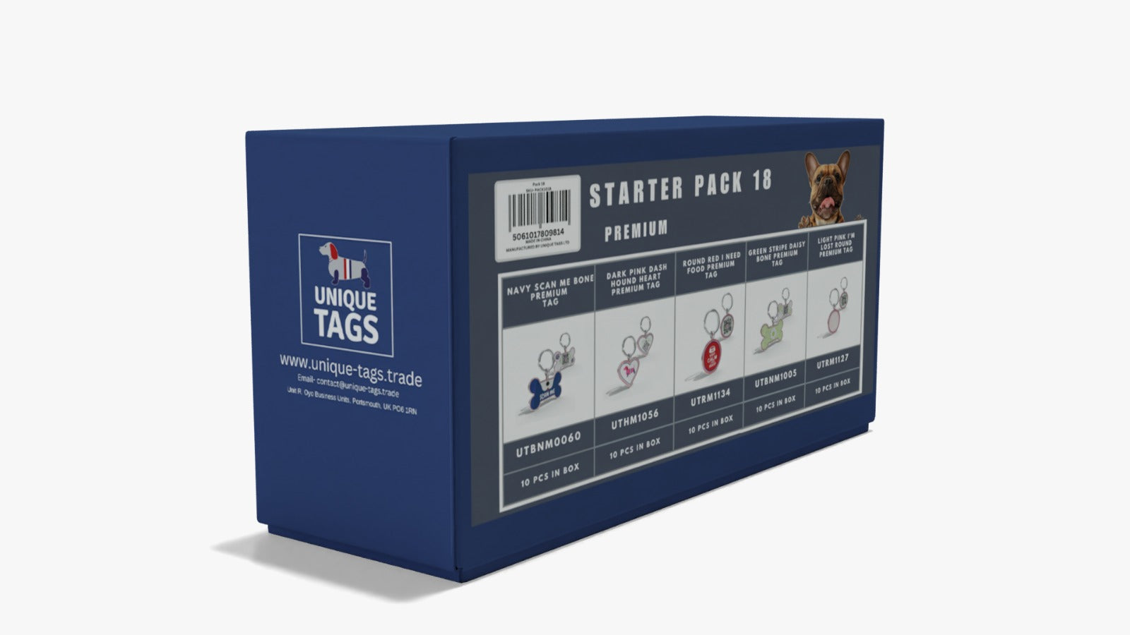 This exclusive Premium Starter Pack with 50 pieces in total offers quite a variety. The pack features 5 types of premium QR tags with 10 of each design, accounting for 50 pieces, that have specific names like the Aqua-Daisy Hearts-Bone-Premium Tag, Dark Pink-I Love my Mum-Heart-Premium Tag, Light Pink-I Need Food-Premium Tag, etc. This assortment will provide ample options for your needs.