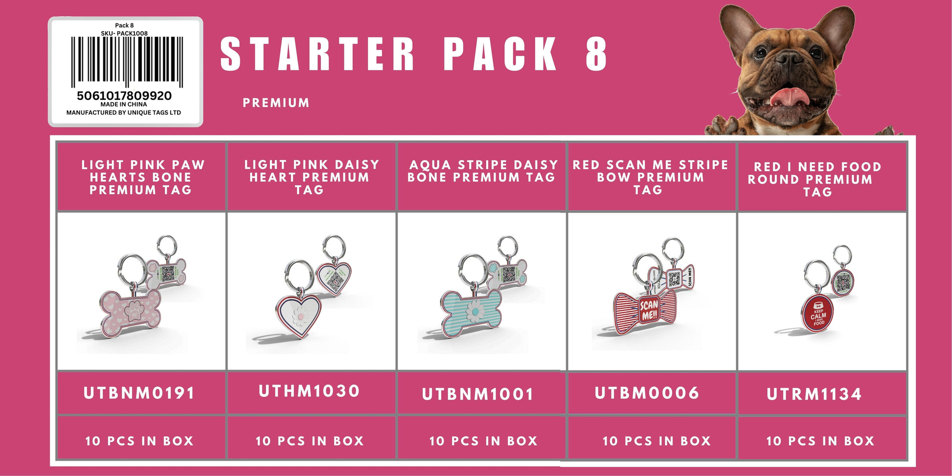 This exclusive starter pack with 120 pieces in total offers quite a variety. The inclusion of 7 different Epoxy QR tags like Red help I'm Lost scan me bone Epoxy tag, Light Pink Dash Hound heart Epoxy tag, Red Pet